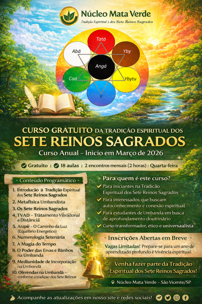 Em março de 2026, o Núcleo Mata Verde abrirá a primeira turma do Curso Anual da Tradição Espiritual dos Sete Reinos Sagrados, totalmente gratuito e preparado especialmente para os iniciantes que desejam compreender, vivenciar e praticar esta doutrina.